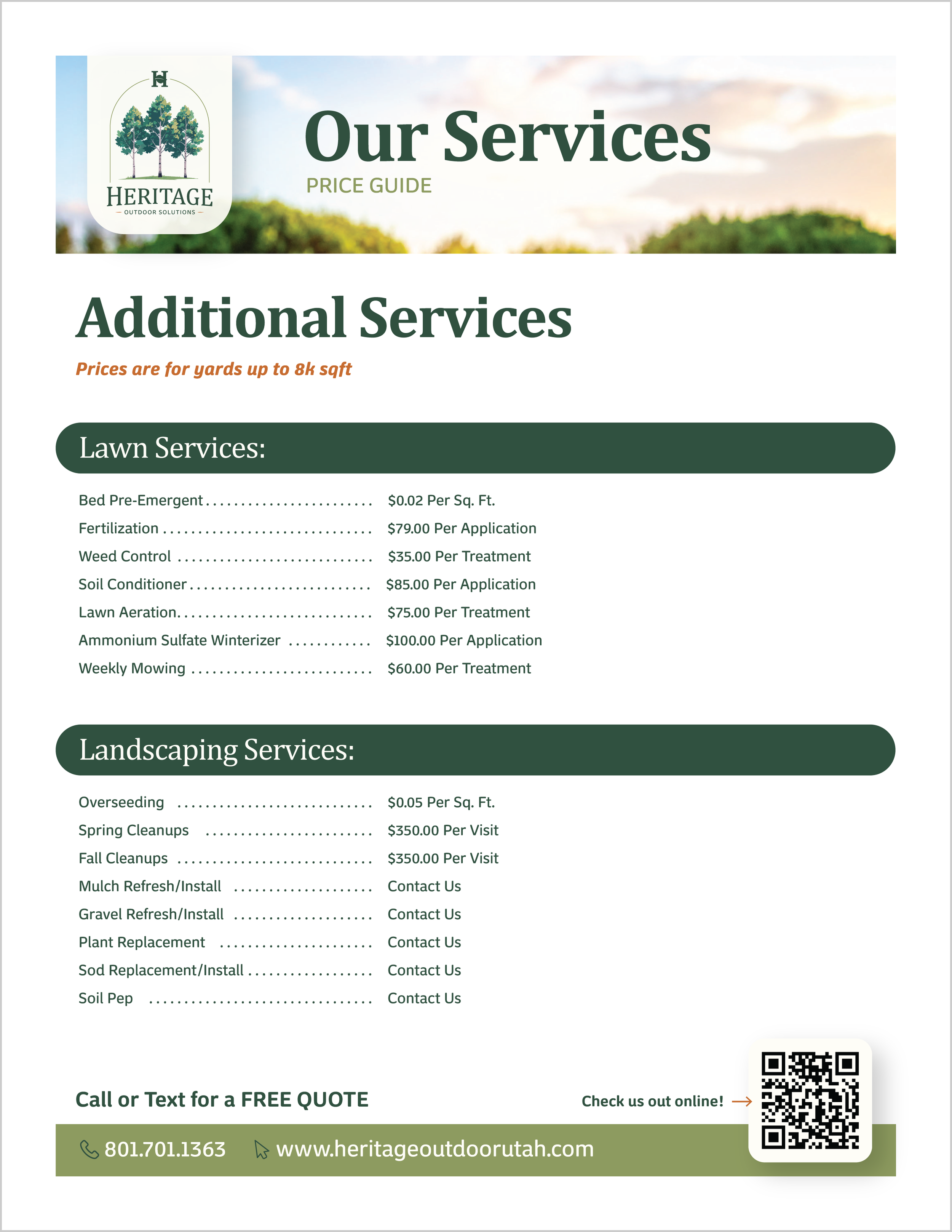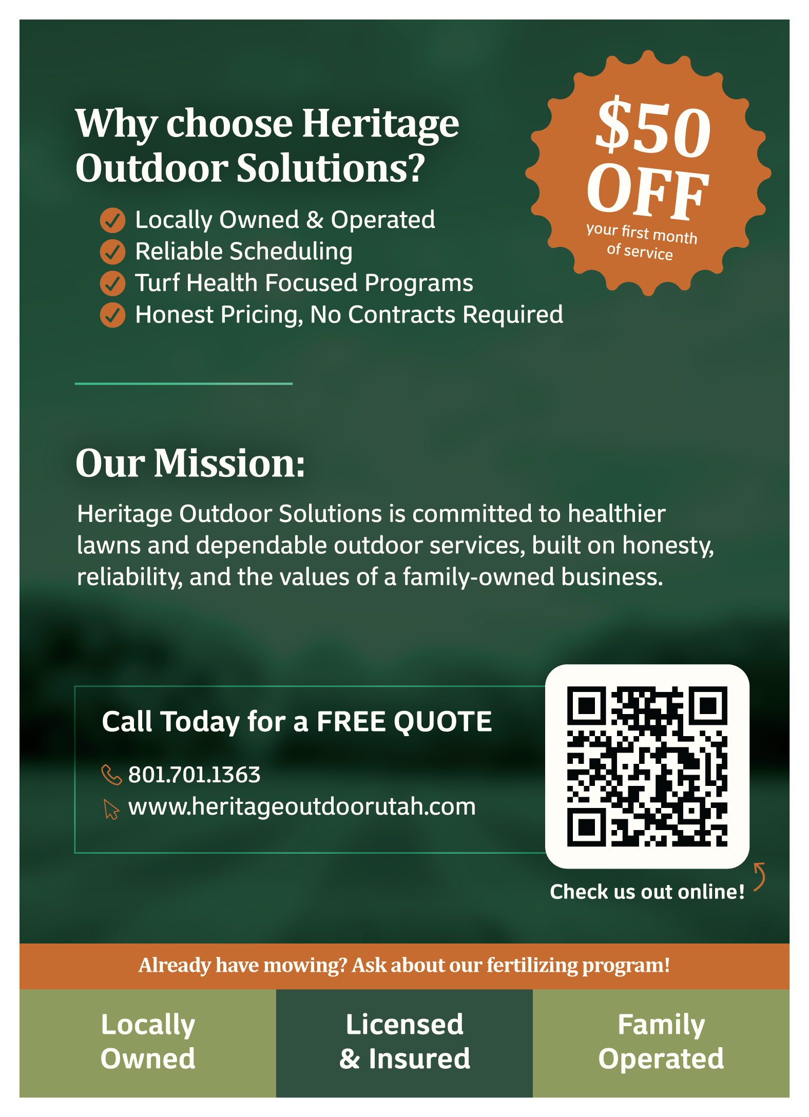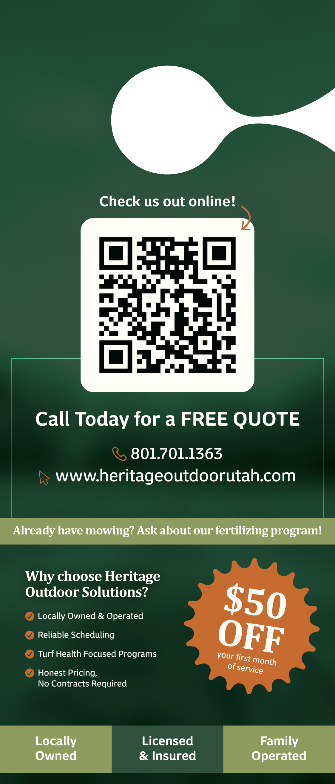 This local landscaping contractor needed a clean, modern brand identity to support the growth of his new business. I developed three logo variations designed for different applications. The primary logo works well on uniforms and branded merchandise, while the secondary logos are optimized for digital use on the website and social media platforms. The color palette draws inspiration from natural landscape tones, paired with a bright orange accent for strong callouts. After establishing the brand identity, I expanded the system to include flyers, door hangers, and branded merchandise to support local marketing efforts.