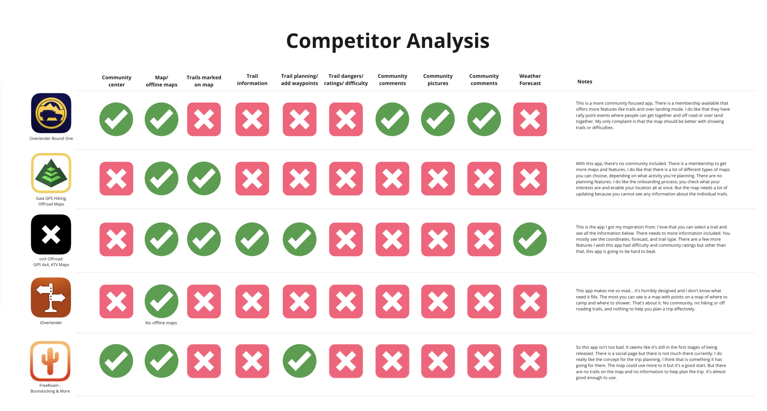 To know how my application would stand up against the competition, I had to do a thorough analysis of my competitors. A few other apps I found are OnX Offroad, Overland Bound One, Gaia GPS, iOverlander, and FreeRoam. While all of these apps had some good features, a few of them did not have a lot of the features that I hoped they would.