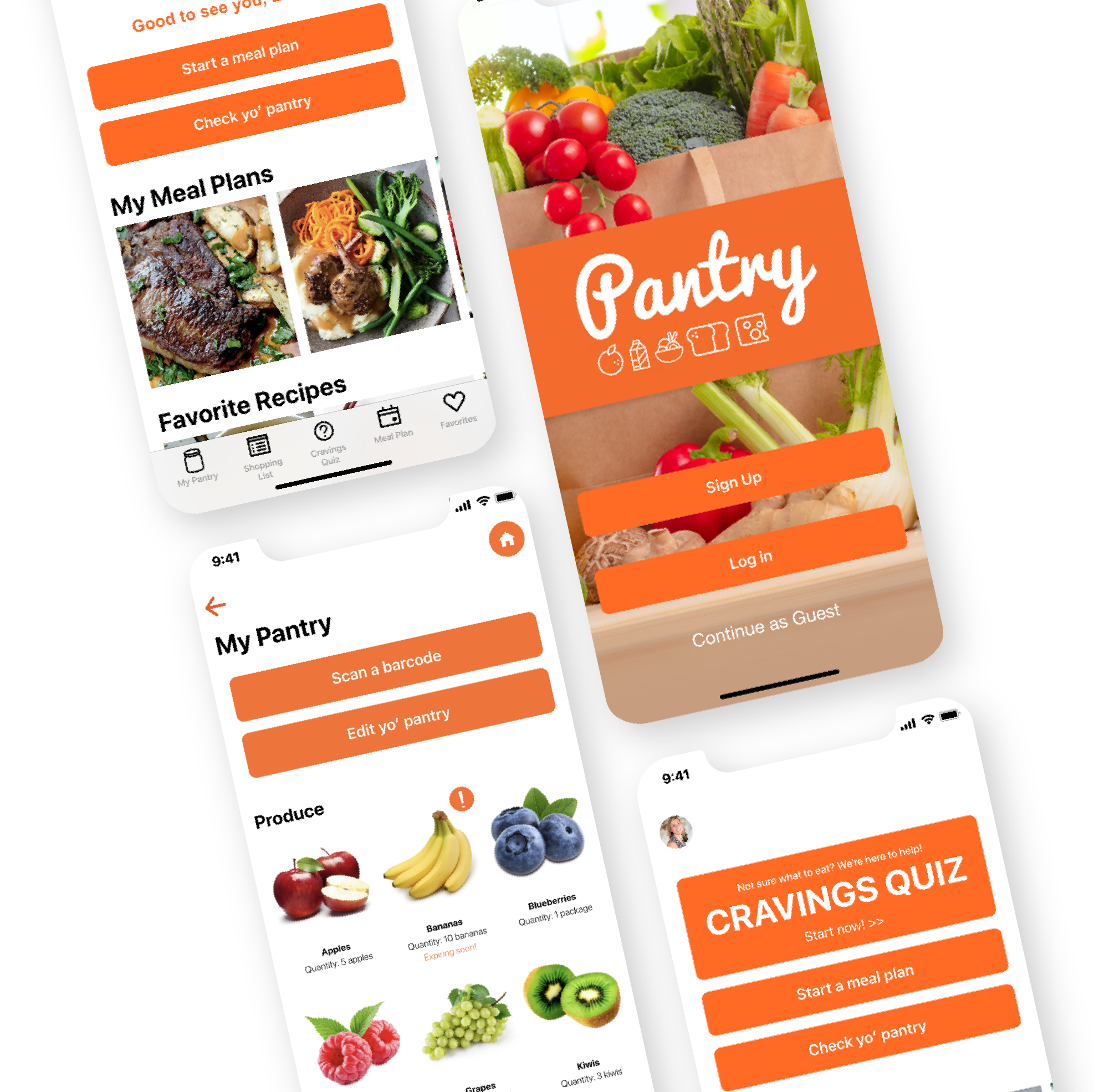 Pantry is a mobile application to help the user answer that dreaded meal time answer; “What should we have for dinner?” The app includes a meal planning function as well as a cravings quiz to help the user find a new recipe to add to your meal plan or restaurant when you’re not in the mood to cook that night.